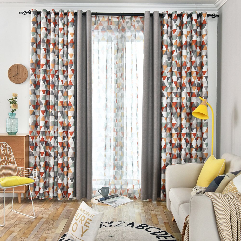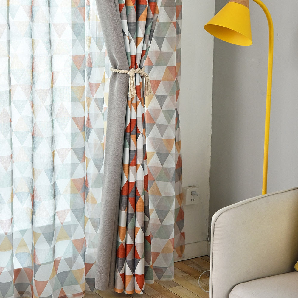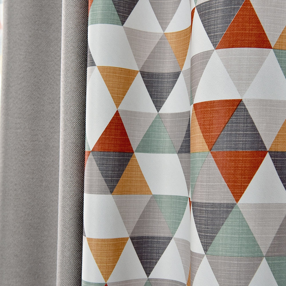 Esta Cortina Opaca con Estampado Geométrico Moderno ha sido pensada para el hogar actual. El patrón geométrico de triángulos pequeños en diferentes tonalidades como blanco, naranja quemado, gris, verde menta y un toque de amarillo, crea una sensación de movimiento y dinamismo. Su diseño versátil permite que se adapte a diferentes estilos de decoración, desde el nórdico hasta el contemporáneo o incluso un toque retro. Además, la combinación de una cortina opaca y un visillo transparente a juego te ofrece la flexibilidad de controlar la privacidad y la entrada de luz según tus preferencias. Siente cómo la atmósfera de tu habitación se transforma con este elemento tan distintivo.