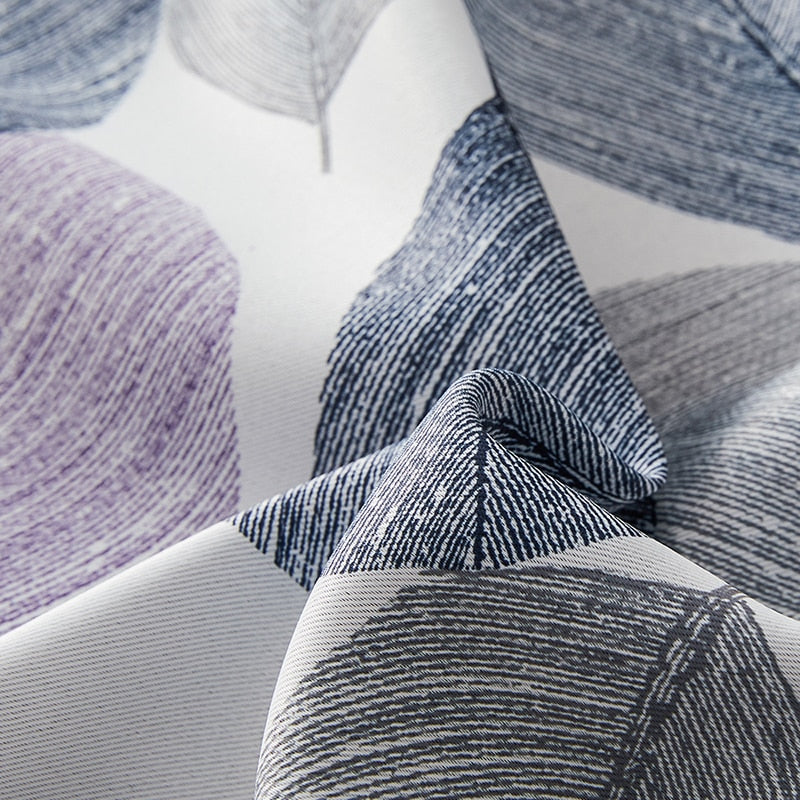 - Diseño moderno y elegante con estampado de hojas en tonos violeta, azul y gris.