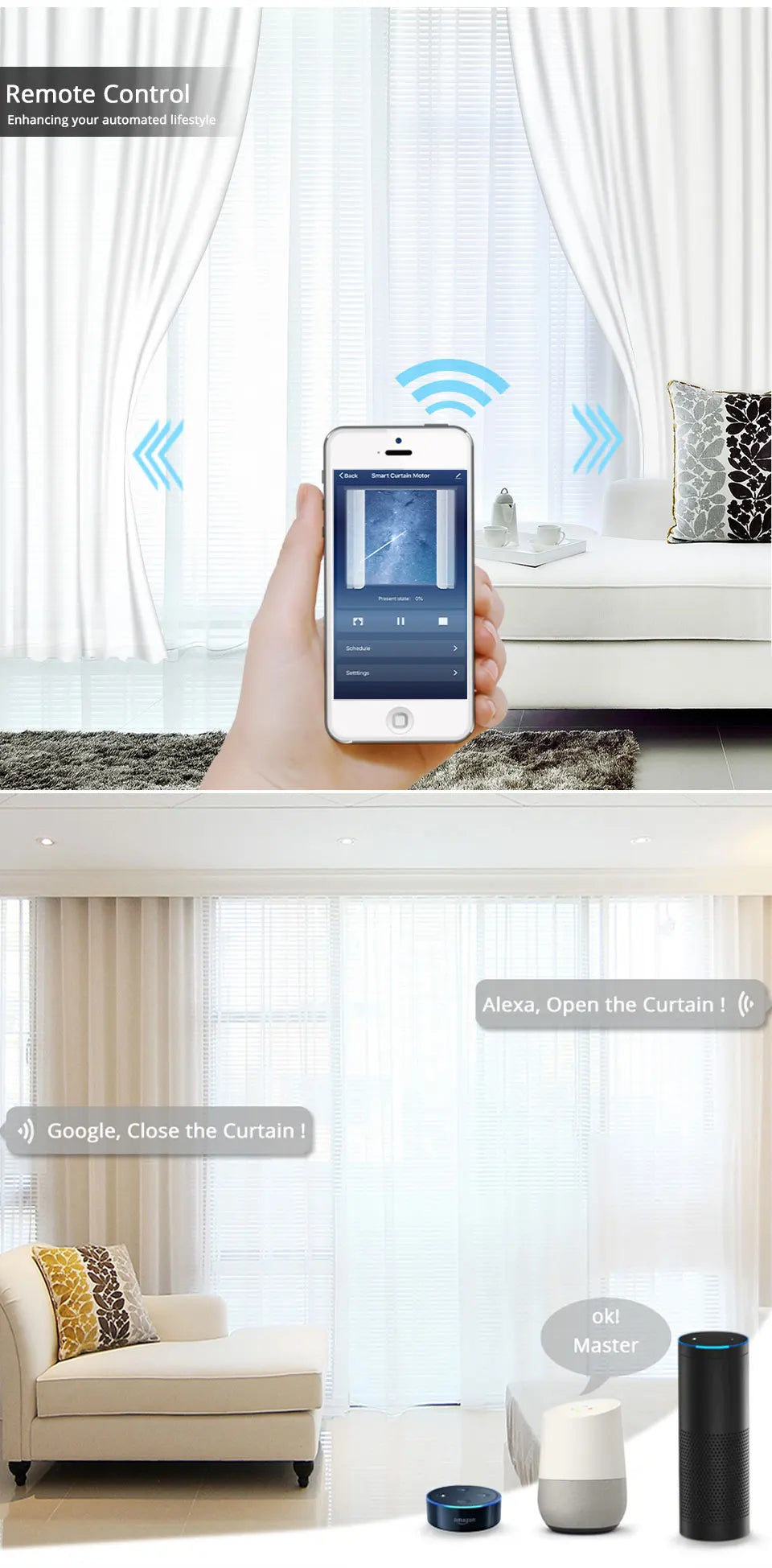 Imagina el confort de controlar tus cortinas sin levantarte del sofá. Con nuestro riel para cortina eléctrico inteligente, esta comodidad está al alcance de tu mano. Diseñado para ofrecer una experiencia de vida moderna y sin esfuerzo, este sistema te permite abrir y cerrar tus cortinas con un simple toque en tu smartphone o mediante comandos de voz. Olvídate de los cordones enredados y los mecanismos manuales complicados. Disfruta de un ambiente perfecto en todo momento, regulando la luz y la privacidad de tu hogar con la máxima facilidad.