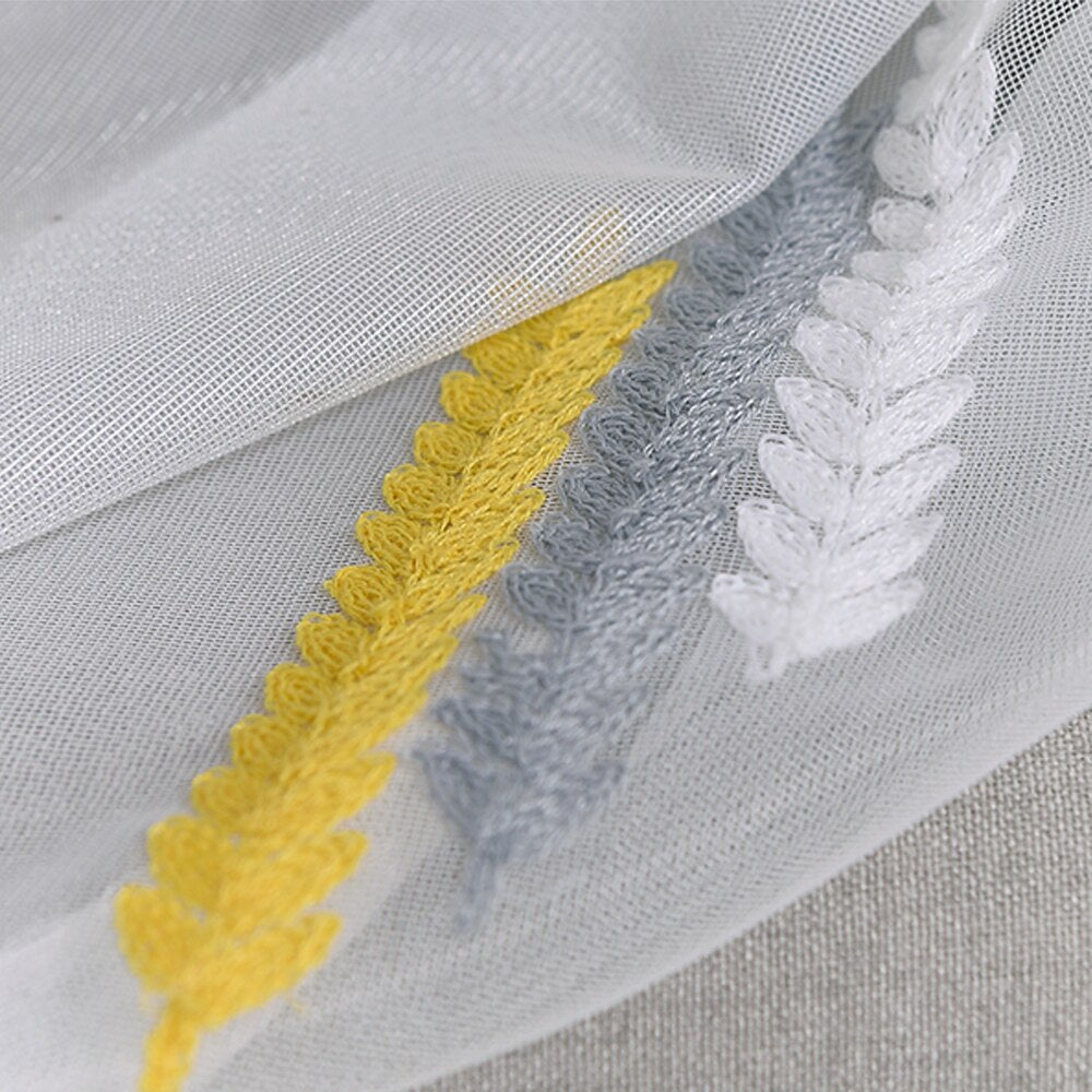 Nuestro visillo bordado con motivo geométrico ha sido diseñado pensando en la versatilidad. Los patrones geométricos en tonos grises y amarillos sobre un fondo blanco translúcido se integran a la perfección con una amplia variedad de decoraciones, desde las más minimalistas hasta las más audaces. Imagina la luz del sol jugando con los delicados bordados, creando sombras interesantes y dando vida a tus ventanas. Es una forma sencilla pero impactante de actualizar tus espacios, aportando textura y color sin recargar el ambiente.