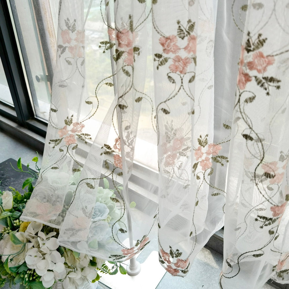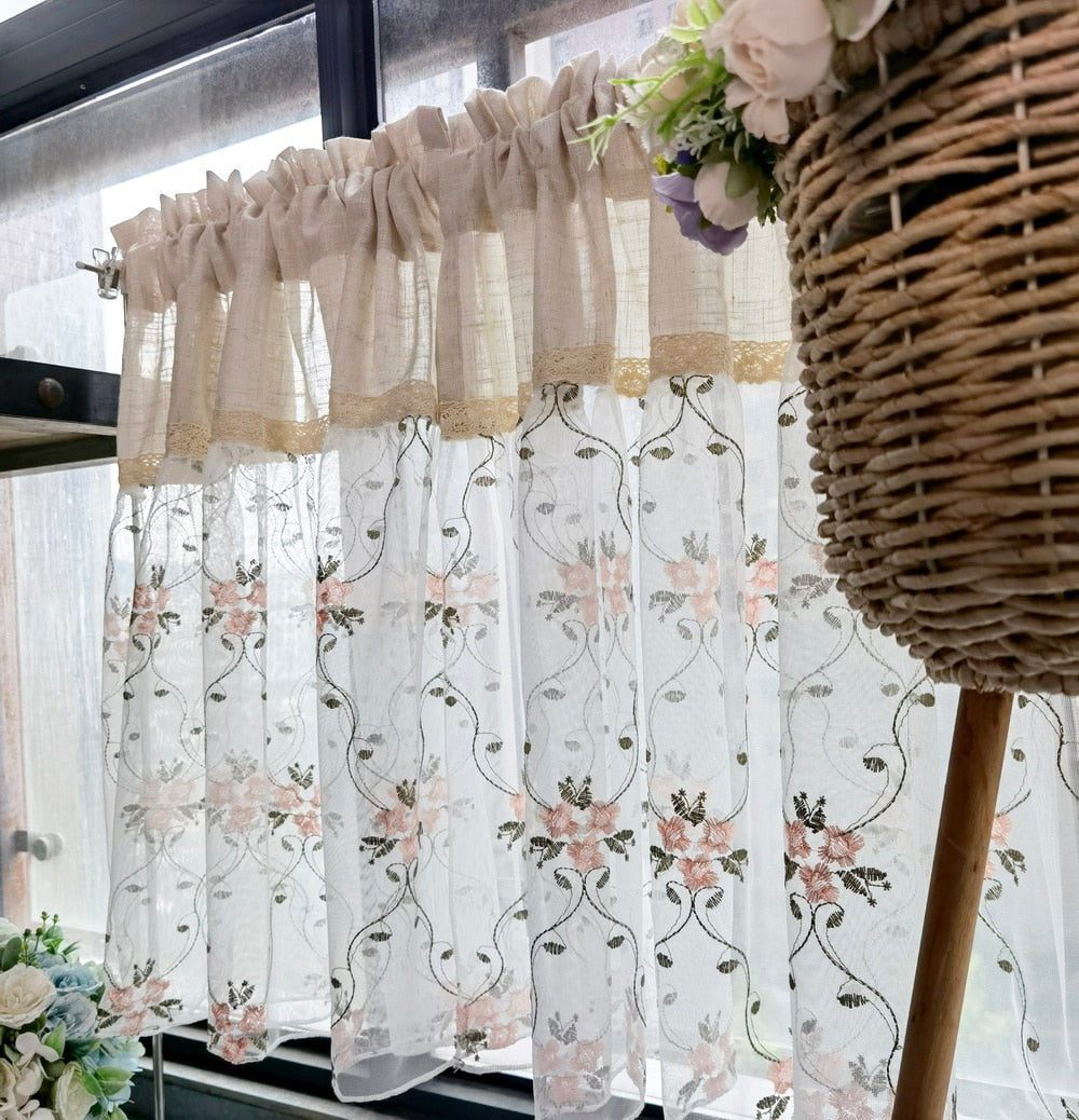 Nuestro visillo es mucho más que una simple cortina. La parte superior, en un tono lino natural, aporta esa sensación campestre y auténtica que tanto te gusta, mientras que su delicado encaje añade un detalle sutil y elegante. Pero lo que realmente lo hace especial son los bordados florales en tonos suaves, que se extienden a lo largo del tejido transparente. Estos patrones, inspirados en la naturaleza, dejan pasar la luz de forma mágica, llenando tu cocina de una luminosidad suave y difusa. Es el complemento ideal para cocinas con un estilo rústico, cottage, o incluso para añadir un toque de dulzura a espacios más modernos.