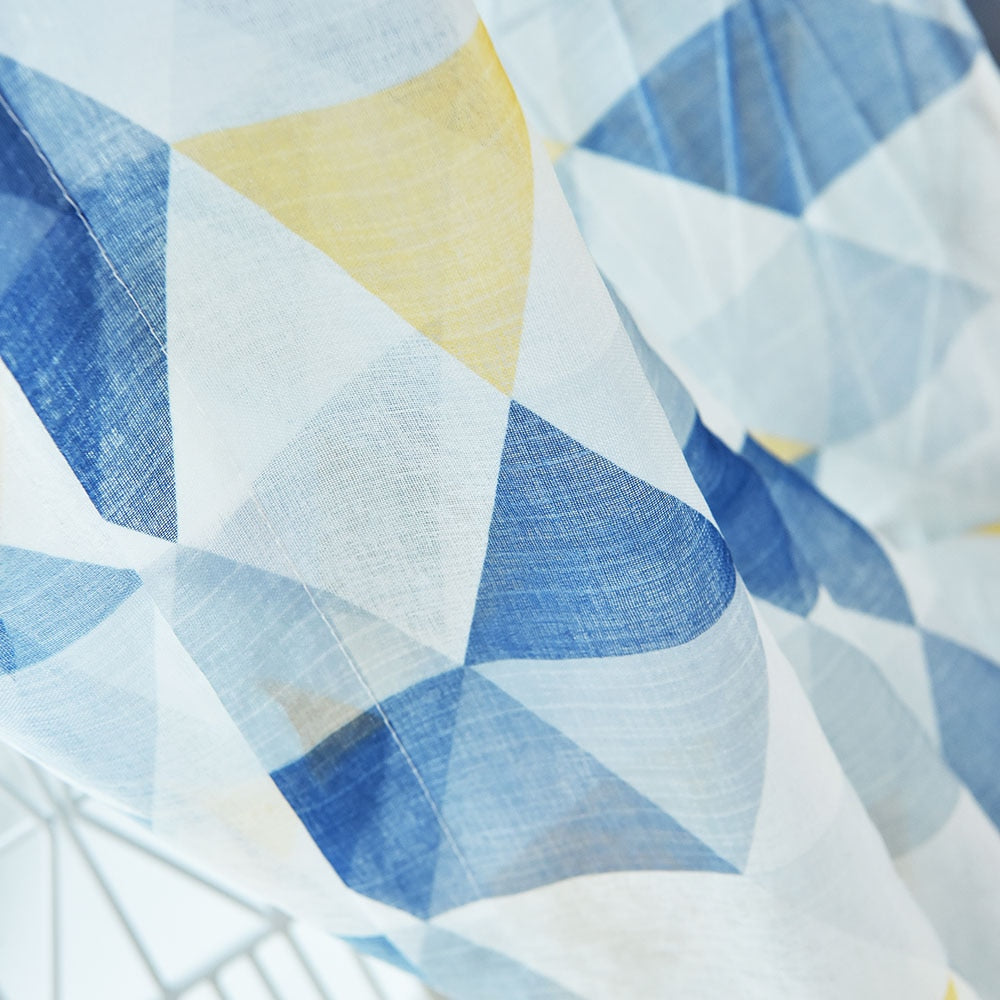 El patrón geométrico de nuestro Visillo Moderno con Motivos Geométricos está cuidadosamente diseñado para captar la atención y complementar una amplia gama de estilos decorativos. Los triángulos en distintas tonalidades de azul, blanco y amarillo se entrelazan armoniosamente, creando un efecto visual dinámico y atractivo. La tela, de excelente calidad, es ligera y permite una caída elegante, realzando la belleza de sus motivos. Es más que un simple visillo; es una pieza de arte textil que elevará el diseño interior de tu hogar, ofreciendo una ventana a la creatividad y el buen gusto.